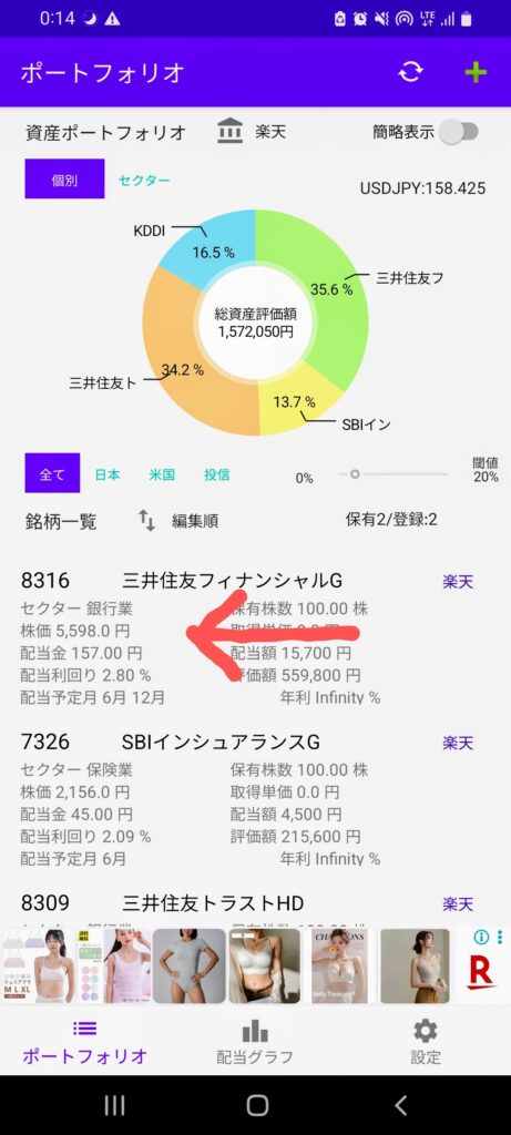 1.削除したい銘柄を左にスイープ