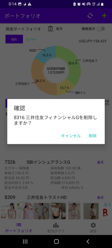 確認画面で削除を選択するすることで銘柄を削除できます。